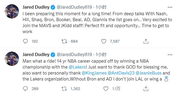 杜德利先是发推:伙计,多么棒的旅程!14年的生涯以在湖人夺得冠军做为收尾,在此感谢上帝对我的保佑,同时也感谢詹姆斯、浓眉、珍妮-巴斯和整个湖人团队,假如没有詹姆斯和浓眉,我就不会加入湖人,当然也不会赢得一枚总冠军戒指。