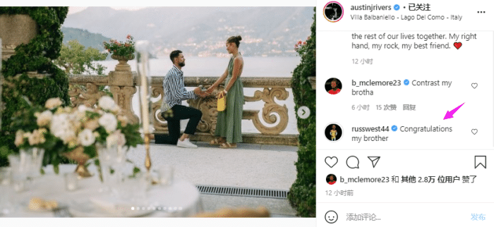 来源:JRS直播网08-24 19:11JRS直播网讯 北京时间8月24日,掘金球员奥斯汀-里弗斯正式宣布求婚成功,他在意大利向女友求婚,单膝跪地真挚求婚,为爱人戴上硕大的钻戒,并且拥抱亲吻爱人;湖人新援威少第一时间留言:恭喜我的兄弟;本-麦克勒莫也恭喜小里弗斯。