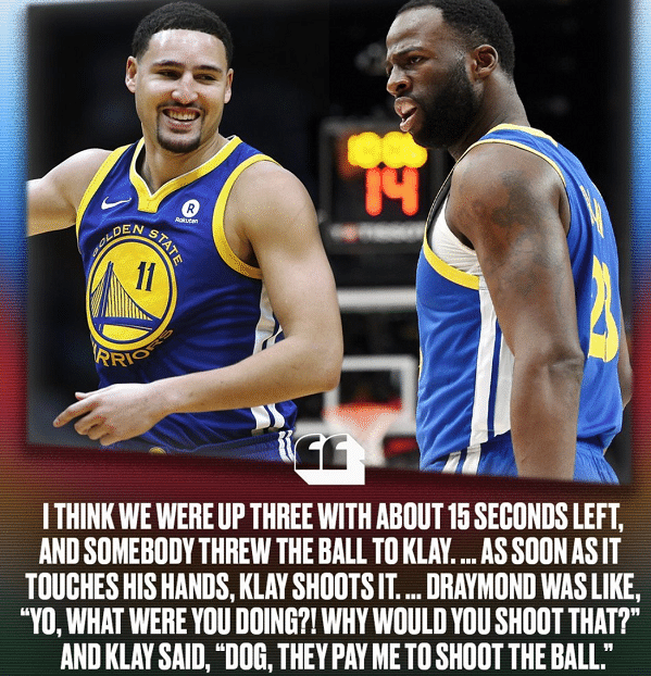 近日前勇士球员费斯图斯-埃泽利在接受采访的时候谈到了克莱和追梦格林赛场上的对话,当时的情况下是勇士领先3分,时间还剩下15秒,队友传给克莱,克莱直接出手三分球。追梦格林称为什么要急着出手呢?因为一旦投不中会给对手追平机会。克莱的回应是:“他们TMD花钱雇我就是要我来投篮的。”