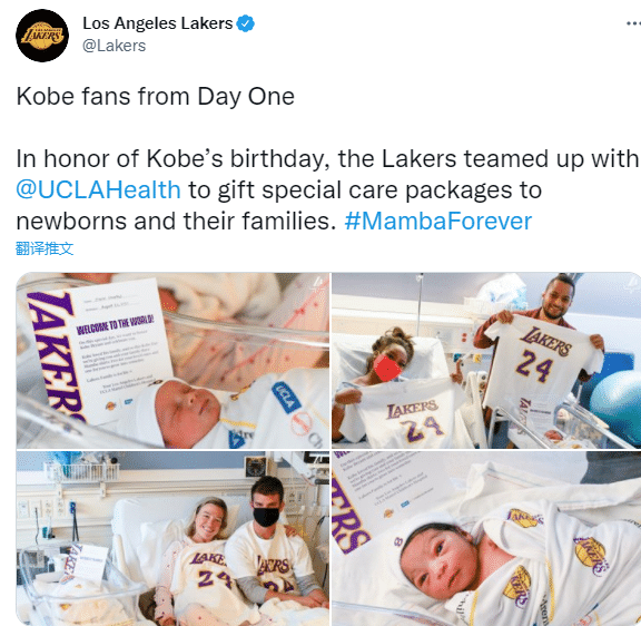 湖人官方晒照并且发推配文:第一天的科比球迷——为了庆祝科比的生日,湖人队向新生儿及其家人赠送特别护理包;这份暖心的护理包里面有三件曼巴T恤——新生儿父母各自获得一件印有科比24号的T恤,婴儿也获得一件T恤,湖人队还为新生儿准备了印有8号的帽子以及包被。