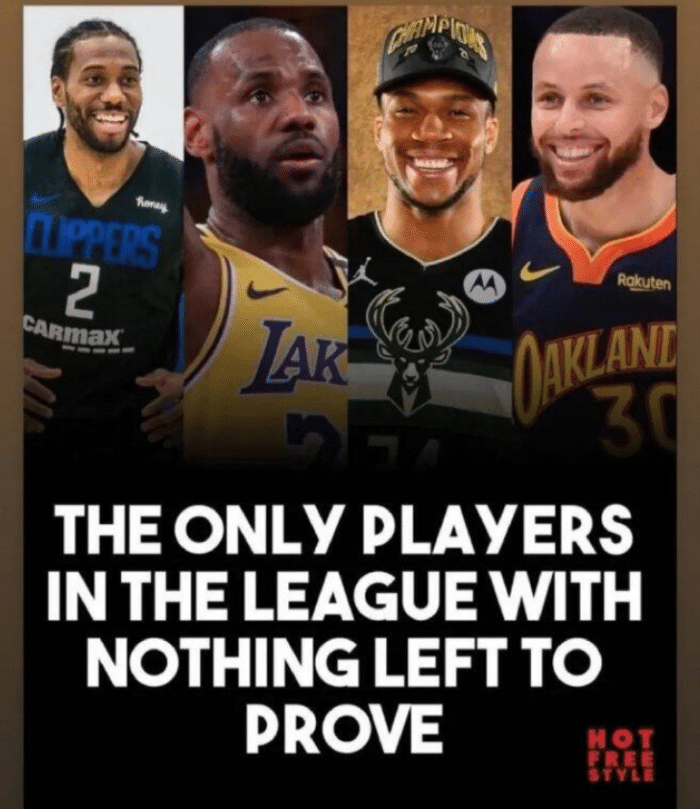 这4人有一个共同点,那就是都作为球队无可争议的核心,率队夺得NBA总冠军。詹姆斯自不必说,莱昂纳德2019年堪称单核夺冠,库里2015年率领勇士夺冠,字母哥上赛季率领雄鹿夺冠。而杜兰特虽然拿到两个总冠军,但没能赢得奥胖的尊重。
