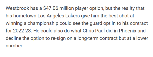 来源:JRS直播网08-22 17:20JRS直播网讯北京时间8月22日,薪金专家鲍比-马克斯解析了明年休赛期的签约形势,他提到了湖人新援拉塞尔-威斯布鲁克。马克斯认为,威少很可能会选择执行2022-23赛季价值4706万美元的球员选项,继续留在湖人效力,但也不排除效仿克里斯-保罗,降低年薪和球队签下长约。
