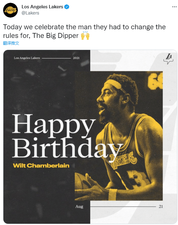 湖人官推晒照纪念张伯伦的85岁生日,发推:今天我们为改变联盟规则的那个男人庆祝生日,北斗星。