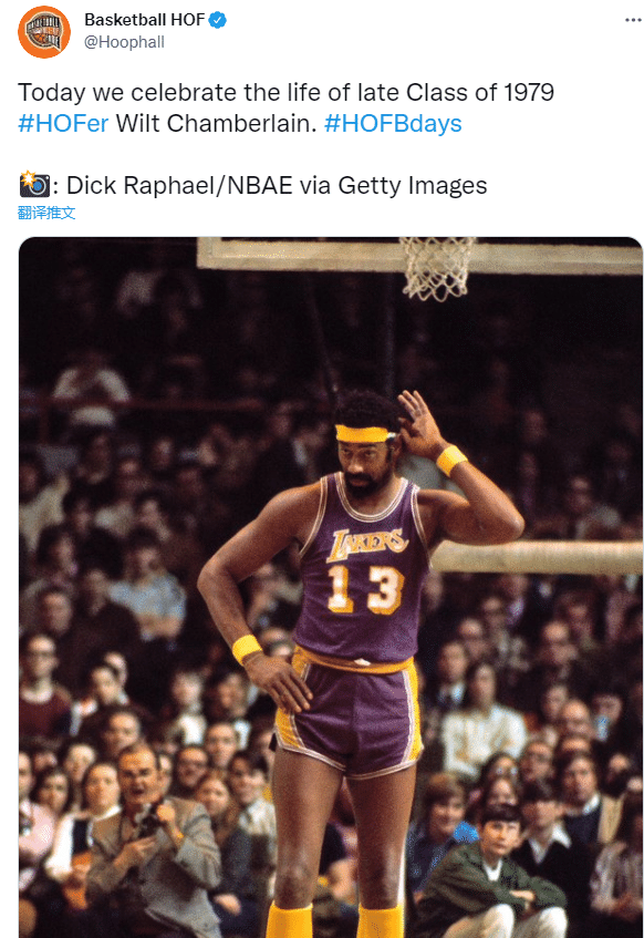 奈史密斯名人堂官推发文:今天我们怀念1979年名人堂成员张伯伦的生日。