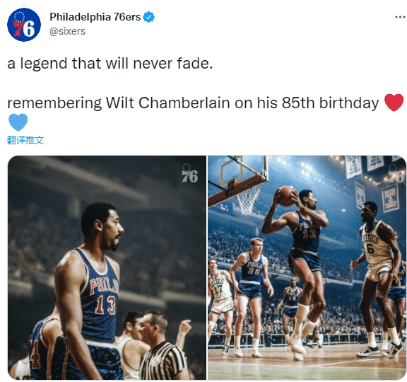 费城76人晒出张伯伦昔日大战凯尔特人的赛场旧照,发推:一位永不消逝的传奇,纪念张伯伦的85岁生日。