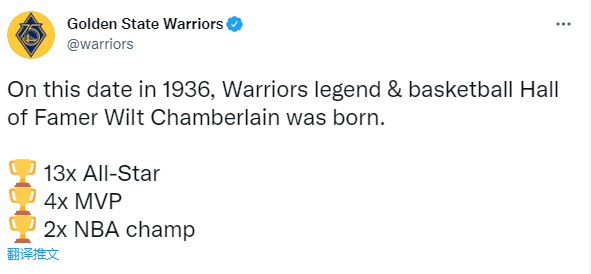 勇士官方晒出张伯伦身穿勇士13号球衣照,发推:在1936年的今天,勇士传奇&名人堂成员张伯伦出生了,13次全明星、4次常规赛MVP和2座总冠军奖杯。