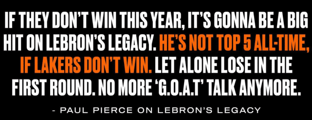 皮尔斯表示:如果湖人新赛季无法夺冠的话,那这将对詹姆斯的历史地位是一个巨大的打击。如果湖人最终无法登顶,他就不是历史前五的球员了。而如果他们在季后赛首轮就出局,那就不会再有GOAT(历史最佳)之争了。”