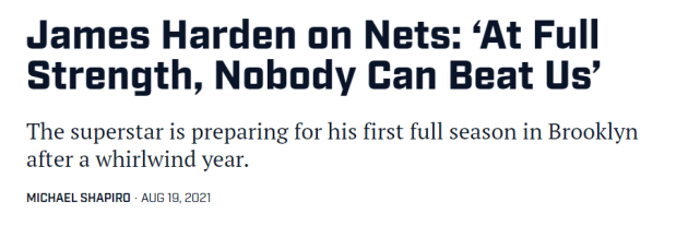 来源:JRS直播网08-20 11:17JRS直播网讯 北京时间8月20日,篮网球星詹姆斯-哈登接受《体育画报》的专访。在这次采访中,哈登豪言篮网在全员健康状态下是不可战胜的,并聊到了他的两位全明星队友:杜兰特和欧文。以下是专访内容——