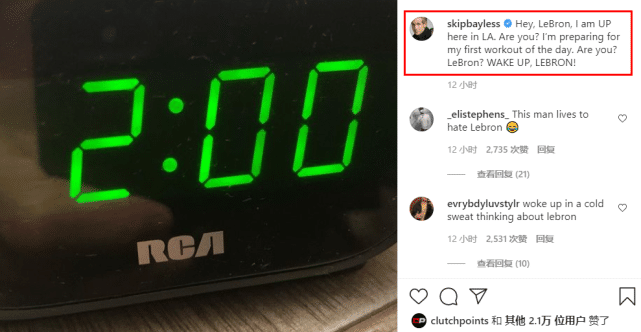 JRS直播网讯 两天前,湖人球星勒布朗-詹姆斯晒出自己凌晨4点20分开练的动态,引起热议。北京时间8月20日,被称为“头号詹黑”的NBA名嘴斯基普-贝勒斯更新社媒,晒出了一张2点时钟的截图,调侃詹姆斯的凌晨训练。