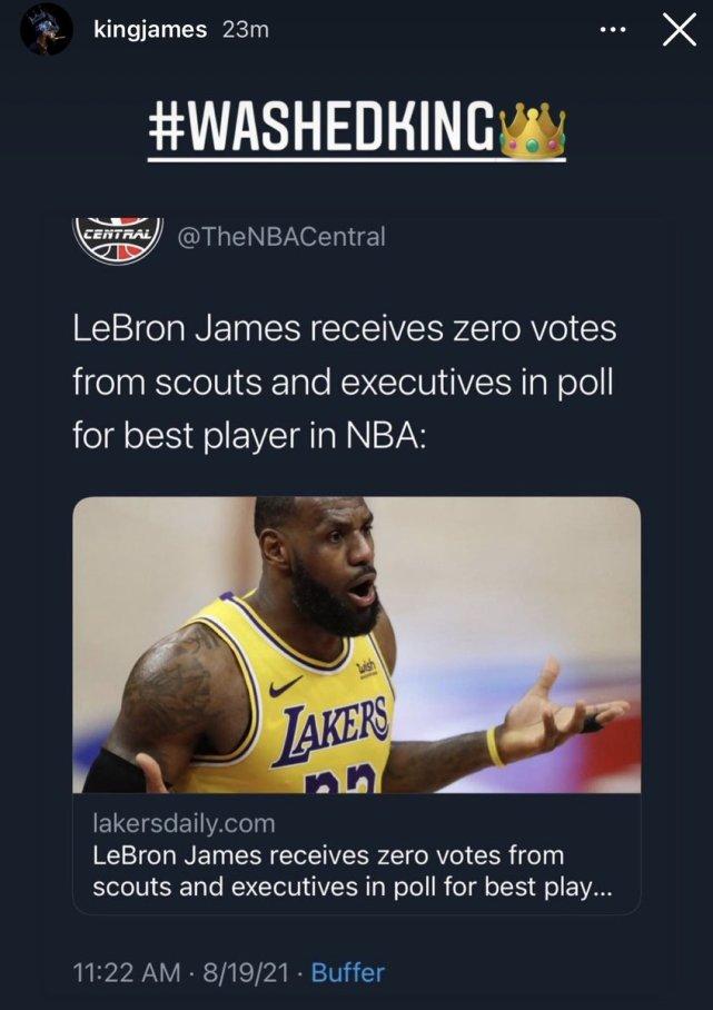 2021-22赛季是他的第19个赛季,这位即将37岁的老将依然处在巅峰期,上赛季场均25分7.7篮板7.8助攻。ESPN邀请10位球探和高管票选新赛季的最佳球员,杜兰特和字母哥各得5票,詹姆斯0票。对此,詹姆斯用“过气的国王”自嘲后,也表示他已经不需要这些东西来激励自己了。新赛季,詹姆斯将和威少、浓眉一起冲击湖人队史的第18座总冠军。