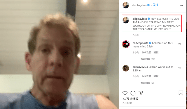 贝勒斯的表演还没结束,他又晒出自己在跑步机上运动的视频,继续写道:“嗨,勒布朗:现在是凌晨2点30分,我已经开始今天的第一次训练了。在跑步机上运动!你在哪儿?”