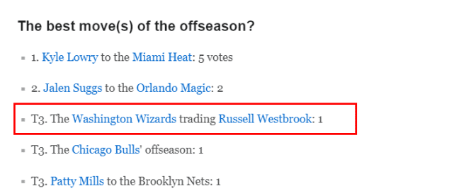 在最烂运作评选中,公牛签下德罗赞得到3票,排名第一,鹈鹕休赛期运作得到3票,位居第二。湖人交易到威少获得2票,排在第三。马刺签下迈克德莫特和篮网未能续约杰夫-格林各得1票,并列第四。