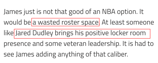 整体来说,他不是一个足够好的选择,尤其是对于一支想要冲冠的球队来说。如果湖人签下他,无异于浪费一个名额。现在,湖人还有三个名额空缺,他们计划签一个后卫和一个侧翼,然后留一个名额看未来需求再确定。