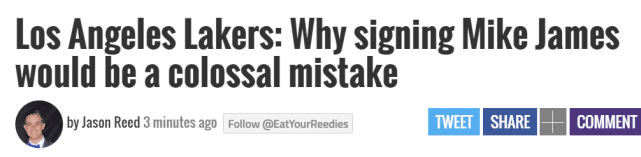 来源:JRS直播网08-19 20:32JRS直播网讯近日,湖人已经试训了小托马斯、达伦-科里森和迈克-詹姆斯。北京时间8月19日,美媒Lakeshowlife认为,在这三名球员中,湖人最不该签的就是迈克-詹姆斯。美媒还列出了这位篮网旧将的两大缺陷,建议佩林卡不要做出令人后悔的选择。