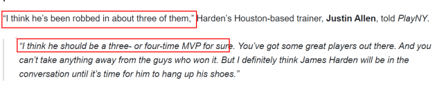 “我觉得他在MVP评选中被‘打劫’过3次,在我看来,他应该是一个能拿3-4次MVP的球员。当然,会有一些很棒的球员,你很难从他们手里夺取他们已经赢得的东西,但我绝对认为詹姆斯-哈登会参与到竞争中来,直到他退役为止。”阿伦说道。