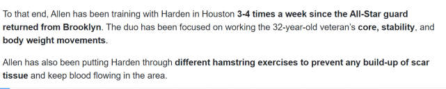 阿伦透露,哈登返回休斯顿后,一周会进行3-4次训练,主要训练内容在于核心、稳定性、体重和移动等。他也会注意哈登的腿筋问题,避免旧伤复发, 保持相应区域的血液畅通。训练师相信,通过休赛期的调整和恢复,哈登走出上赛季的季后赛低谷,重返巅峰,联手欧文和杜兰特再次冲击总冠军。