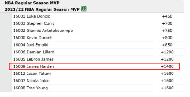 不过,新赛季的最新MVP赔率榜上,哈登并不被看好,赔率+1400,只排在第八的位置上。排在他前面的七位球员依次是东契奇(+450)、库里(+700)、字母哥(+750)、杜兰特(+800)、恩比德(+850)、利拉德(+1200)和詹姆斯(+1200)。