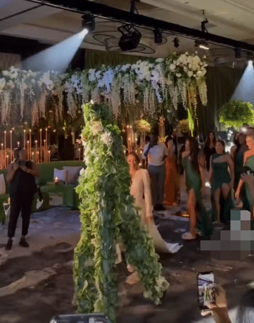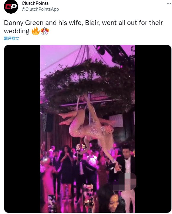 艺术家在现场为格林夫妇绘画,一个穿着绿色怪物服装的人在大厅里溜达,几名美女悬挂在旋转的吊灯上为他们倒酒,格林的婚礼相当奢侈!美媒CLutch Points转发视频,发推:丹尼-格林为他和妻子的婚礼全力以赴。