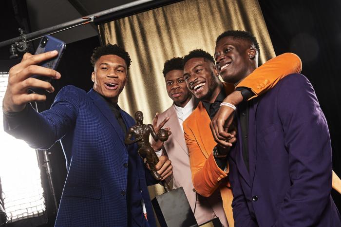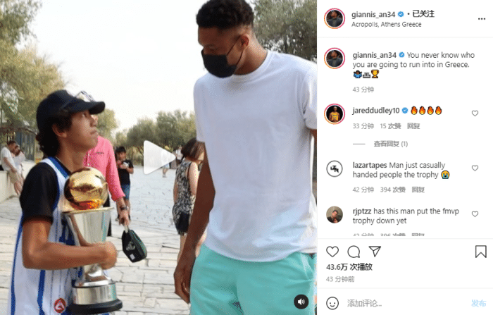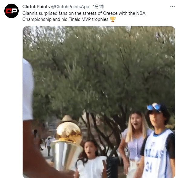 字母哥身穿白色T恤和短裤,抱着总决赛MVP奖杯走在大街上十分显眼,引来无数人围观;字母哥主动上前把FMVP奖杯递给一位身穿字母哥球衣的小球迷时,路边的美女一脸惊讶的表情,不敢相信眼前发生的一切。