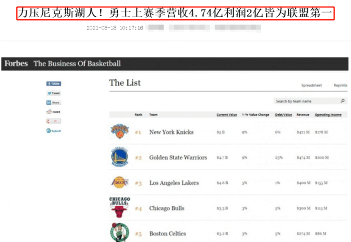 据统计,勇士在过去一年的收入为4.74亿美元,净利润为2亿美元,这两项数据都排在NBA第一位。而尼克斯的收入为4.21亿美元,净利润达到1.78亿美元,排在第二,豪门湖人营收4亿美元,净利润达到1.55亿美元,由于拥有詹姆斯,湖人也同样赚翻了。