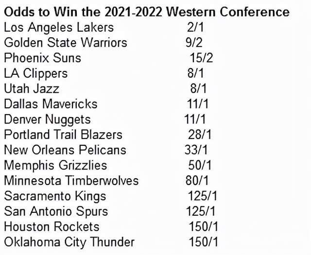 来源:JRS直播网08-18 16:43JRS直播网讯随着NBA各支球队的引援都已经结束,现在各支球队的实力也基本上差不多了,而美媒也发出了最新西部冠军的赔率,一起来看一下吧。