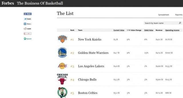 NBA上赛季营收利润排行榜:尼克斯第二,湖人仅第三,勇士力压群雄