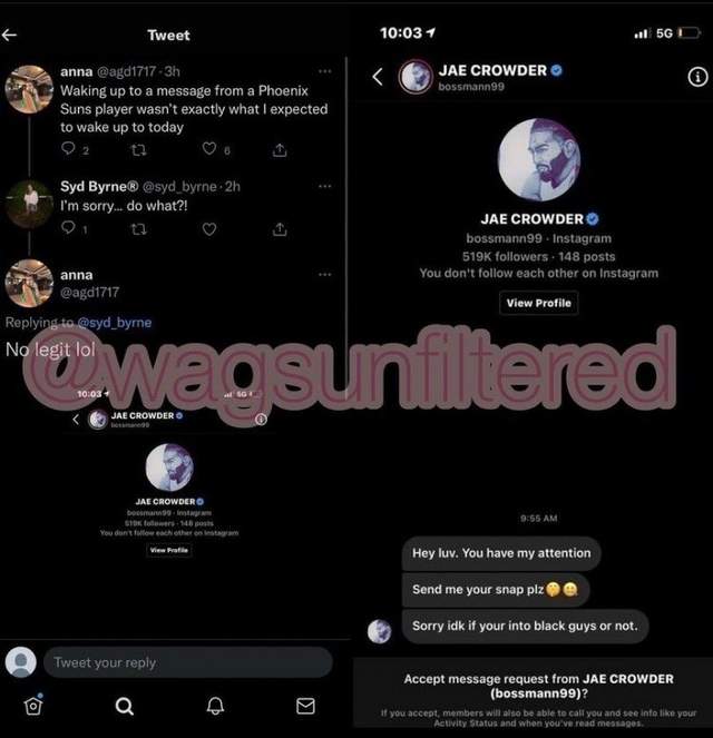 一般女生看见有NBA球员撩自己应该会有一种异样的感觉,对于这种有着千万年薪的球员,很多女性或许也会回应克劳德的话。不过很显然anna不是什么随便的女性,她非但没有回应克劳德,反而是在社交媒体上将其曝光,看起来anna是真的不喜欢克劳德这种突然的接触。而且有网友问到anna克劳德给自己发了什么东西,她还说那是不合法的东西,或许克劳德是发了一些什么私密照片给对方。
