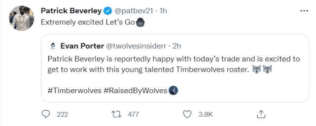 Evan Porter写道:“据说贝弗利对今天的交易很开心,并对于和年轻的森林狼阵容一起工作感到兴奋。”贝弗利转发后写道:“超级兴奋,加油吧!”