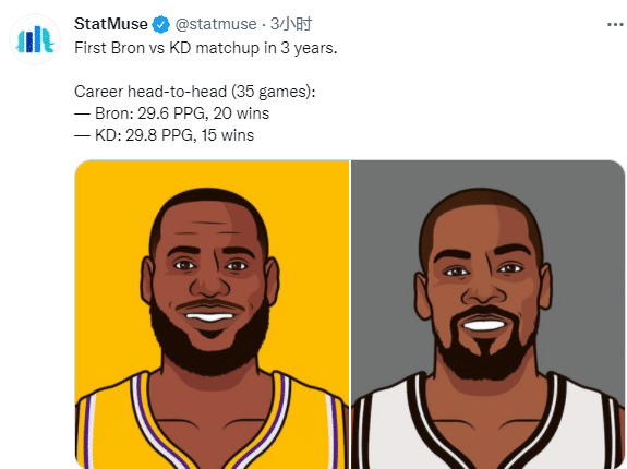 时隔三年,詹姆斯终于又对决杜兰特,上赛季两人因伤无缘直接对决,但新赛季两人将在圣诞大战对决;此前詹姆斯已经和杜兰特直接交手35次,詹姆斯场均29.6分战绩是20胜15负,杜兰特场均29.8分,詹姆斯战绩方面占优。