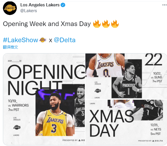 新赛季揭幕战将在10月20日开打,湖人主场对阵勇士,这将是湖人新三巨头詹姆斯、浓眉和威少的首秀,也将是威少、安东尼等新援的湖人生涯首秀;湖人对阵勇士将是揭幕战最硬的一道菜;另一组对决是雄鹿迎战篮网,新科FMVP字母哥再战篮网三巨头,这对决同样值得期待。