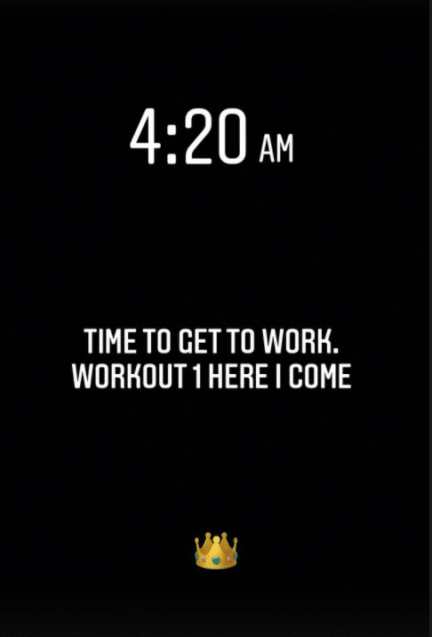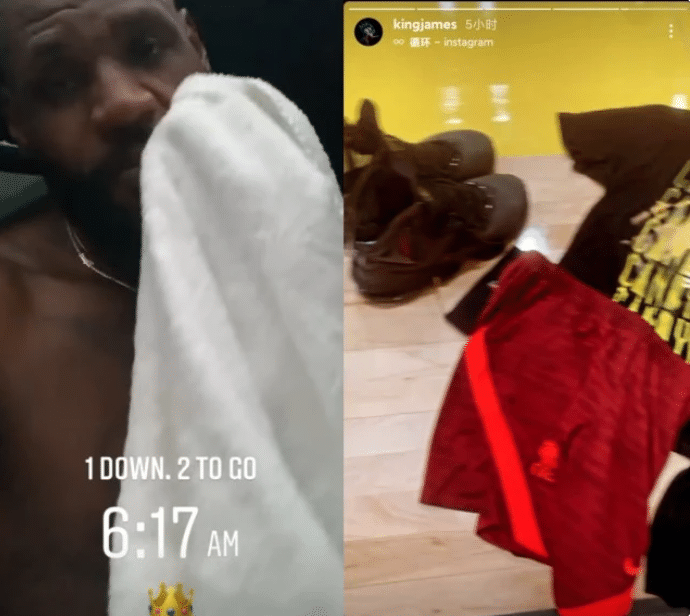 詹姆斯更新社交媒体,先是写道:凌晨4点20分,是时候开始训练了,第一次训练,我来了;之后詹姆斯晒出自己坐在车里擦汗的画面,配文:完成了1次训练,还有2次,早上6点17分,第二练我在路上。