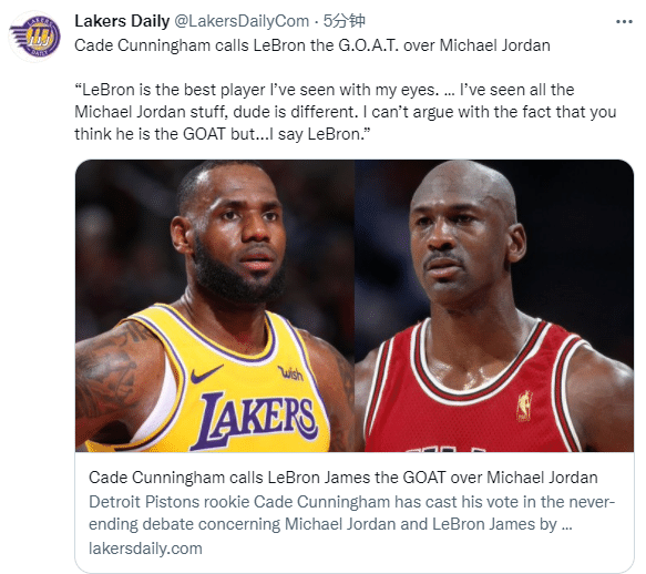 另外要说的是活塞19岁状元凯德-坎宁安直言詹姆斯已经超越乔丹成NBA历史最佳(GOAT)。