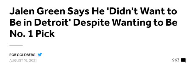 “我想成为状元秀,但论及城市,我不想去底特律。”格林在采访中说道,“我在休斯顿感觉更舒适,给人感觉非常亲密和熟悉。而在底特律,我觉得自己好像重新回到了G联赛的隔离赛区,我可是刚从那里出来,大概就是这种感觉。”