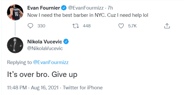 这段动态引起球迷的热议,有球迷调侃两人的发量都快没了,还需要理发师?富尼耶的魔术前队友武切维奇也来凑热闹。他回复富尼耶道:“兄弟,一切都结束了,放弃吧。”