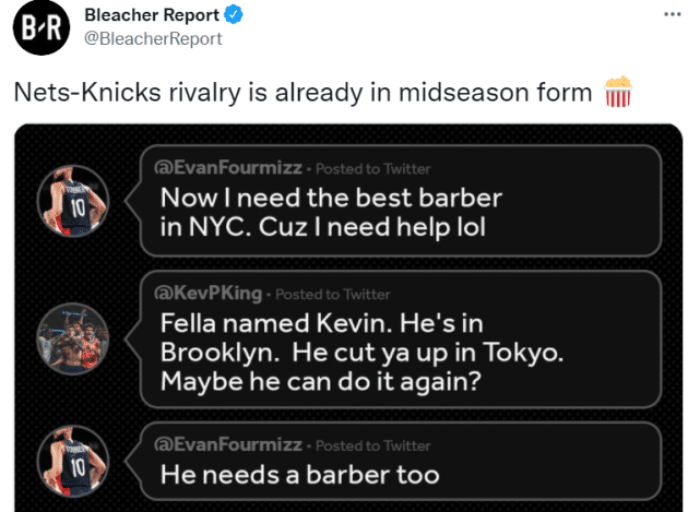 来源:JRS直播网08-17 15:22JRS直播网讯 北京时间8月17日,尼克斯新援富尼耶更新社媒,和球迷互动。他调侃篮网球星杜兰特的发型,引起球迷的热议。美媒Bleacher Report转发富尼耶的动态,看热闹不嫌事大地评价道:“篮网和尼克斯的竞争,已经进入赛季中期状态了(爆米花表情)。”