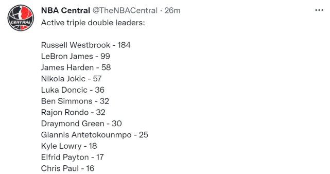 威斯布鲁克的三双次数不但是现役第一,而且已经超越罗伯特森(181次),成为历史第一。目前,联盟历史上只有4名球员的三双次数至少达到100次,除了威少和罗伯特森,还有“魔术师”约翰逊(138次)和基德(107次)。詹姆斯还差1次就能达到100次三双,他有望在2021-22赛季完成这一里程碑。