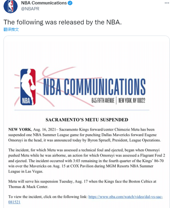 此前国王和独行侠比赛中,末节还剩3分多钟,国王领先多达18分;梅图试图扣篮却被奥莫鲁伊凶狠犯规而重摔倒地,当时奥莫鲁伊直接吃到二级恶意犯规,梅图瞬间暴怒,爬起来就冲过来,挥拳肘击到奥莫鲁伊的头部,两人陷入引发更大的冲突,所幸两人被拉开,最终他俩都被直接驱逐离场。