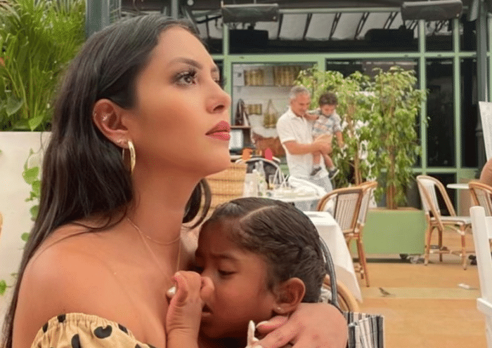 这应该是瓦妮莎闺蜜给她拍的照片,角度非常好,不得不感慨,瓦妮莎颜值实在太高了。瓦妮莎抹了淡淡的口红,戴着耳坠,并没有浓妆艳抹,但她自身的气质实在太出色了,只是一个眺望远方的瞬间,就让人非常难忘,长长的眼睫毛,高高的鼻梁,加上一双炯炯有神的眼睛。而瓦妮莎的小女儿则趴在瓦妮莎的怀里,玩弄着瓦妮莎脖子上的吊坠。