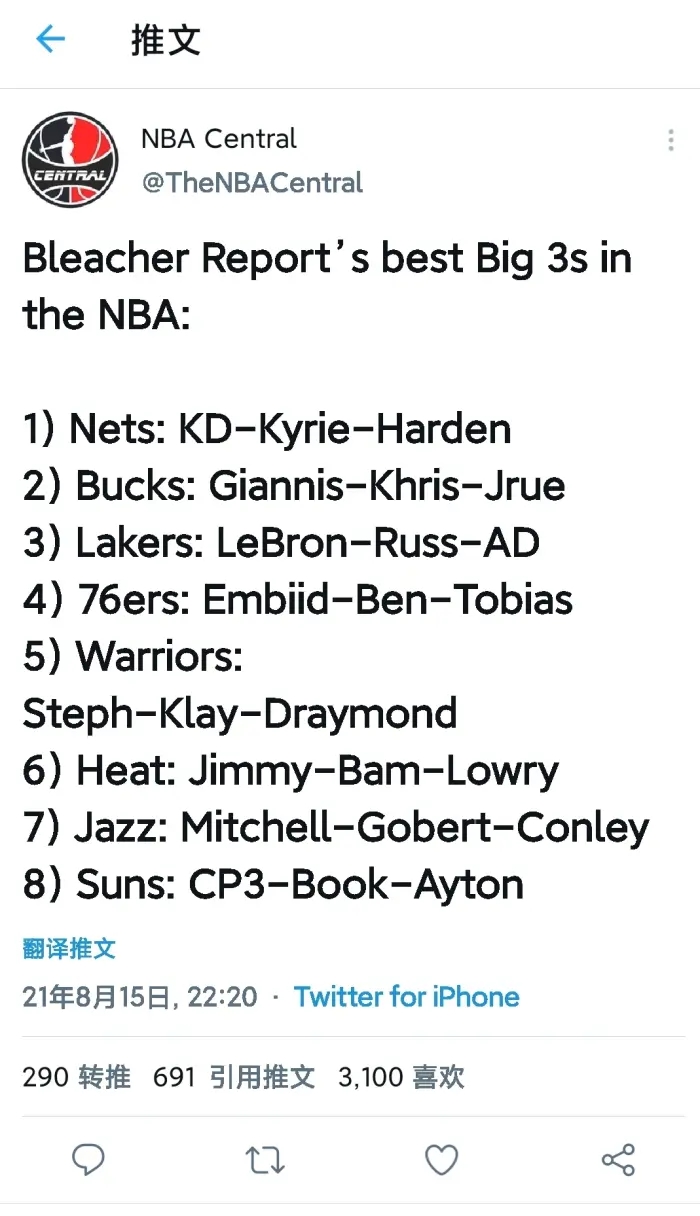 来源:JRS直播网08-16 16:21JRS直播网讯 北京时间8月16日,美媒B/R今日将新赛季各队的三巨头进行了排名,在如今这个联盟想夺冠三巨头可能是标配,拥有多个核心才能走得更远,我们来看看!