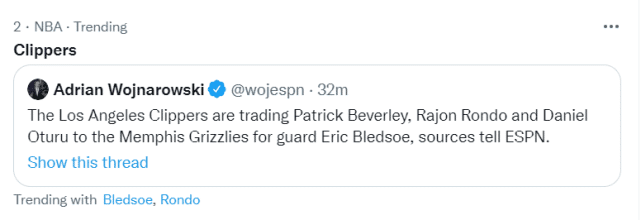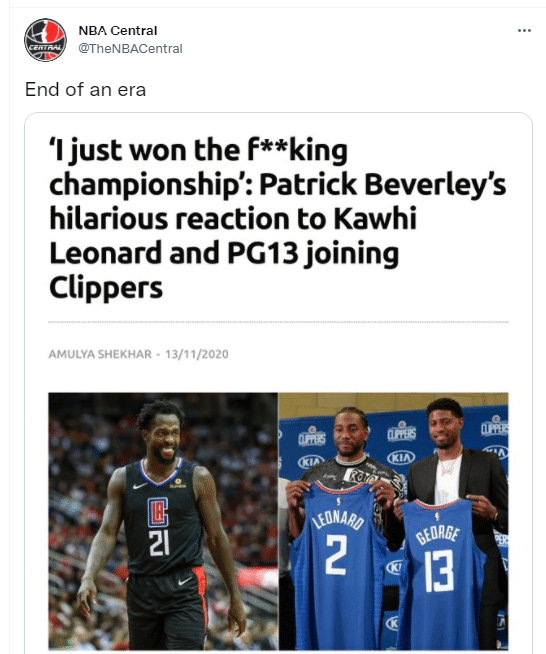 这笔交易让快船很快冲上热搜,而美媒Nba Central则发出贝弗利在乔治和小卡加盟后的夺冠言论,调侃一个时代终结了。