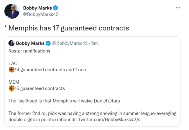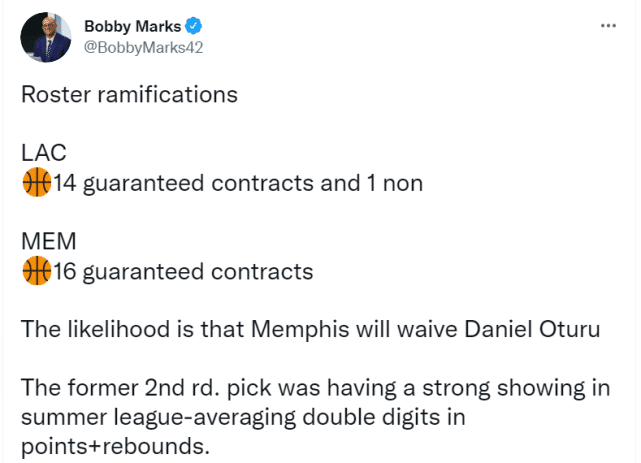 在阵容方面,这笔交易完成后,快船阵容中有14份保障合同和1份非保障合同,灰熊阵容中有17份保障合同,马克斯预测最可能被裁掉的一位是奥图鲁。