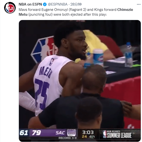 独行侠新秀奥莫鲁伊首发上场24分钟,8投3中拿到7分5篮板1助攻,国王球员梅图此战上场22分钟,10投2中拿到7分7篮板2助攻3抢断2盖帽,最终国王86-70大胜独行侠;一场悬念不大的夏季联赛居然发生冲突,当时国王领先18分,可以说比赛已经进入垃圾时间。