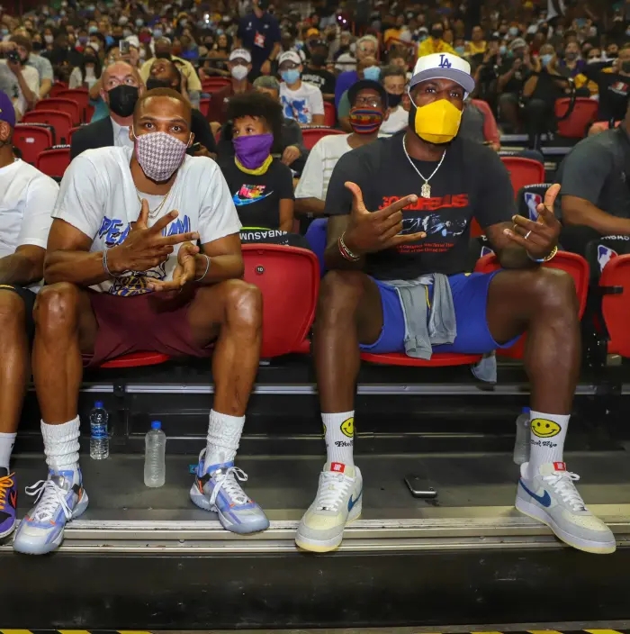 老詹和威少两人则是在今日早些时候社媒公开了两人训练的画面,两人在努力培养化学反应!一直有人说两人都不太擅长远投,所以组合不会有成效。两人还刻意在社媒互动了一下来怼喷子,随后便携手出线在了湖人与活塞夏季联赛比赛的现场,互动频繁,在比赛第三节搞笑离场!