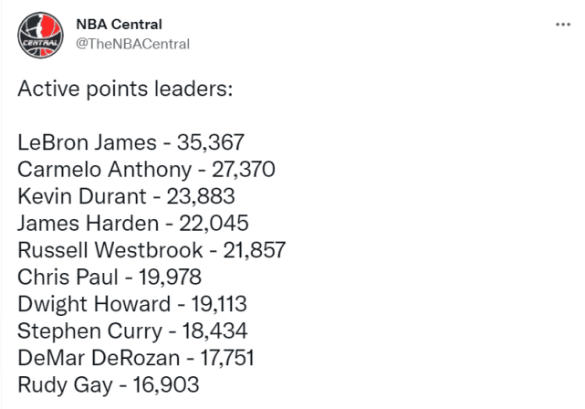 NBA现役得分榜前十:詹姆斯居首湖人占四席!保罗只差22分创造历史