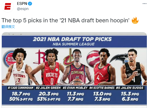 夏季联赛至今,19岁状元坎宁安场均拿到18.7分,三分命中率高达50%;榜眼杰伦-格林场均轰下20.3分,投篮命中率51.4%,3分命中率52.6%,罚球命中率92.9%,真实命中率70.7%;探花莫布里场均11.3分7.7篮板,4号秀巴恩斯以及5号秀萨格斯也表现不错。