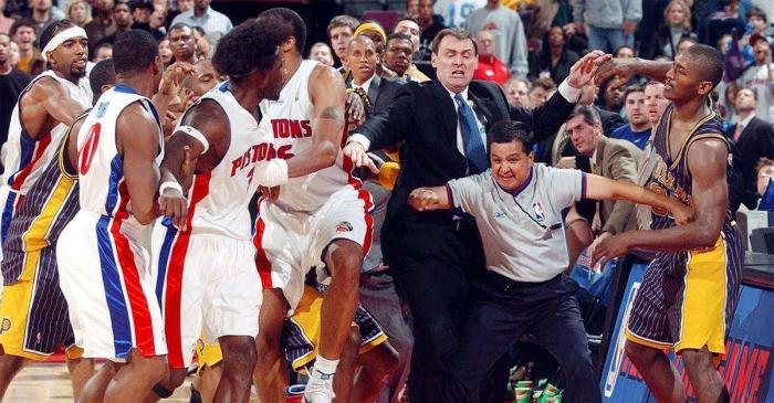 这次臭名昭著的事件在全场比赛只剩下45.9秒时,阿泰极为不冷静地对本华莱士恶意犯规,随后遭到猛推回应,双方球员和裁判劝架,阿泰躺在技术台上试图冷静下来。但一位不冷静的球迷往他身上撒了一杯啤酒导致战火升级,小奥尼尔、斯蒂芬杰克逊、阿泰等人纷纷在看台上暴揍球迷,这场斗殴最终的处罚结果是9人遭遇禁赛合计140多场,多达十余名警卫遭到解雇!