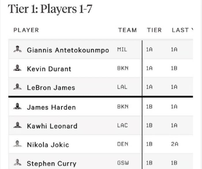 字母哥、杜兰特和詹姆斯是1A,算是精英级别的了!上赛季字母哥带队夺冠,一定程度上提高了媒体对他的评价,总决赛轰下50分14板5盖帽的疯狂数据。杜兰特排前三没有任何争议,他的能力在那放着,要不然篮网也不会提前给他3年1.98亿的顶薪。37岁的詹姆斯仍排在联盟第三位,自律和努力程度让人们仍看好他下赛季处在巅峰,带领湖人前进。