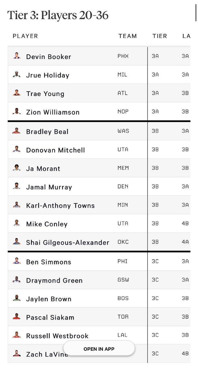 3A布克、霍勒迪、特雷杨、锡安。3B比尔、米切尔、莫兰特、贾马尔穆雷、唐斯、康利、亚历山大。3C本西蒙斯、追梦格林、杰伦布朗、西亚卡姆、威少、拉文。有争议的一点威少排名不如追梦和本西蒙斯靠前?要知道他们也都不擅长远投,但威少至少是三双王,而且在其他方面的贡献也是这两位不能比的!