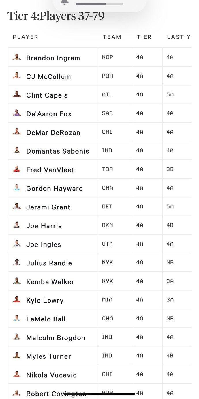 这一档的球员就更多了,克莱、兰德尔、罗斯、德罗赞、波津等人都上榜!卡佩拉排名相当靠前,比较有趣的有三个人的排名!考文顿、小库里和乔哈里斯,三人都是功能性角色球员,因为这一档的排名是37-79位,也还算是符合吧!