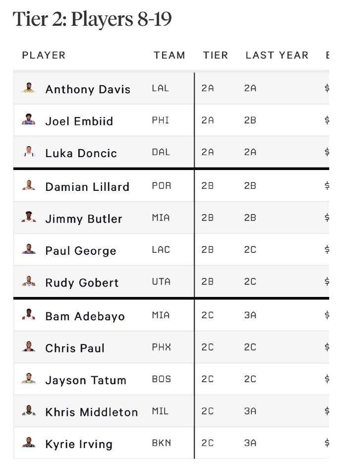 2A三人,浓眉哥、恩比德、东契奇,2B则是利拉德、巴特勒、乔治和戈贝尔,2C阿德巴约、克里斯保罗、塔图姆、米德尔顿、欧文!重点提到保罗,他也37岁了,能排在这个位置着实不易,上赛季的表现非常棒,今夏又获得了1.2亿续约真是人生赢家,新赛季仍将对冠军发起冲击!